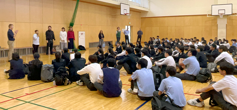 毎年開催している千葉県立の公立中学校での2日間ワークショップでは、MLS講師8名が10名程のグループごとに様々な活動を行いました。年度末の海外研修に向けての下準備となる内容や、大阪万博など昨今話題のトピックを取り上げ、異文化理解や教育現場においてのテクノロジーについての学びを深めました。さらに各自が自分のトピックを決めて考えをまとめ、皆の前でスピーチ発表を行いました。