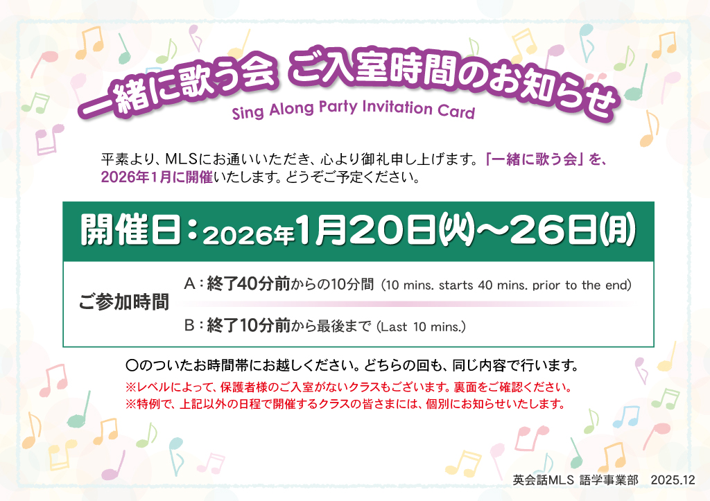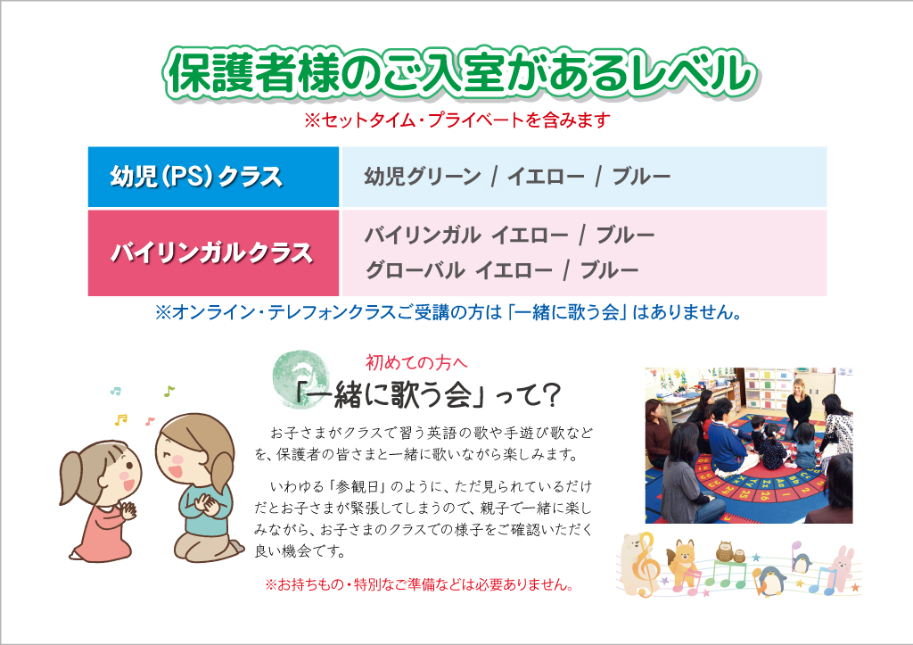| ご入室時間: | 保護者さまを2グループに分けてご案内します。どちらのグループになるかは、教室でお渡しするチラシをご参照ください。 A:クラスクラス終了の40分前から10分間 B:クラス最後の10分間 |