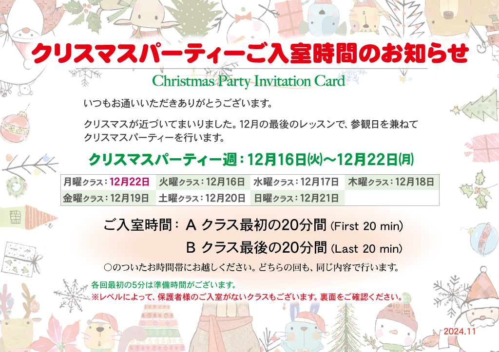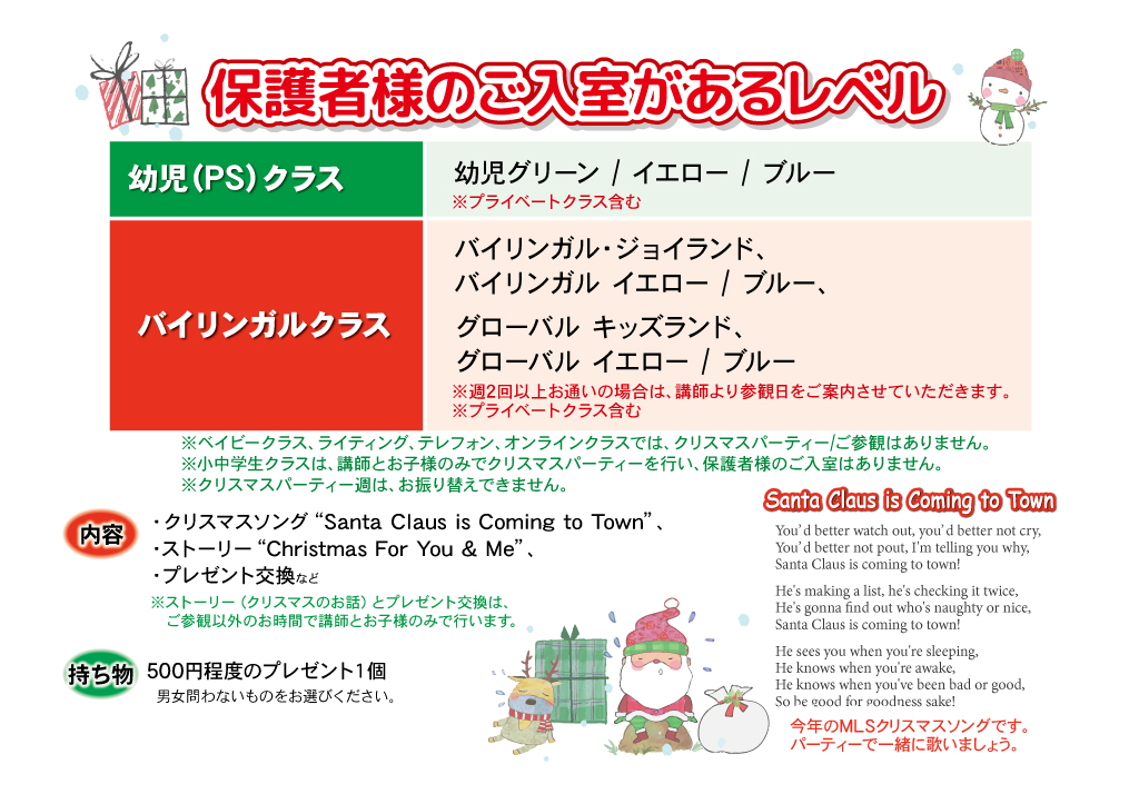 クラス内「クリスマスパーティー」のお知らせ MLS本部 2025年11月21日 Jr. Times 12月16日(火)〜22日(月)のレッスンで、クリスマスパーティーを行います お間違いのないようスケジュールをご確認ください。 対象外のクラス:「ベイビークラス / テレフォン英会話 / ライティング/オンライン」クリスマス週の間は、振替受講ができません ■お持ちもの ■お持ちもの ※セットタイムプライベートクラスではプレゼント交換はありません。保護者様にはクラスをご見学いただけます。 全レベル共通 プレゼント(500円程度)クラス全員でプレゼント交換を行います※お菓子の詰め合わせでも構いません。※男女問わないものを1つご用意ください。 ※セットタイムプライベートクラスではプレゼント交換はありません。保護者様にはクラスをご見学いただけます。 ■予定している内容 楽しいお話 “Christmas For You & Me” ※ご参観以外のお時間で行う予定です。クリスマスソング “Santa Claus is Coming to Town” 音源はこちら ※会員ページ用IDとパスワードが必要です 11/24 (月・祝)頃から配布のお知らせで、ご入室時間をご確認ください おすすめ ぜひご紹介下さい! 研修事業部からのお知らせです 2025年11月14日 MLS会長 奈良橋陽子出演の映画「TOUCH」 2025年1月日本公開 2024年11月18日 MLSアンバサダー Amyのレクチャー 1月に開催 2025年11月1日