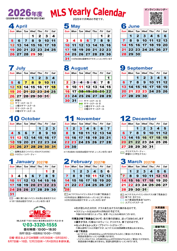 2026年度レッスンカレンダーを公開しました MLS本部 2025年12月2日 Jr. Times 2026年4月〜2027年3月まで、一年分のレッスンと行事の予定が載っています。「印刷用」にPDFデータもアップしてありますので、ご活用ください。 おすすめ ご紹介キャンペーンをリニューアル 2025年6月23日 1月に 幼児クラス「一緒に歌う会」を行います 2025年11月21日 MLSアンバサダー便り – 日本での暮らしをご紹介 2023年6月15日