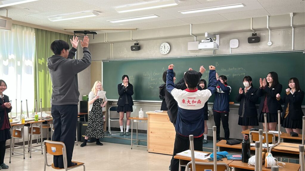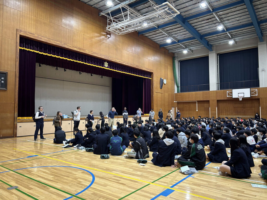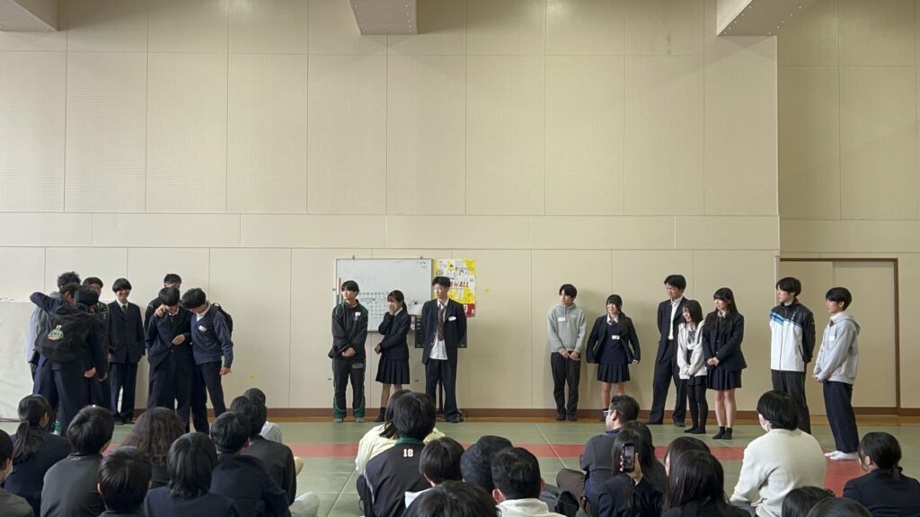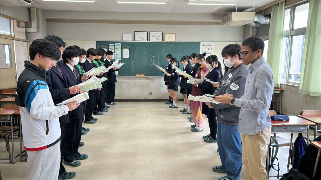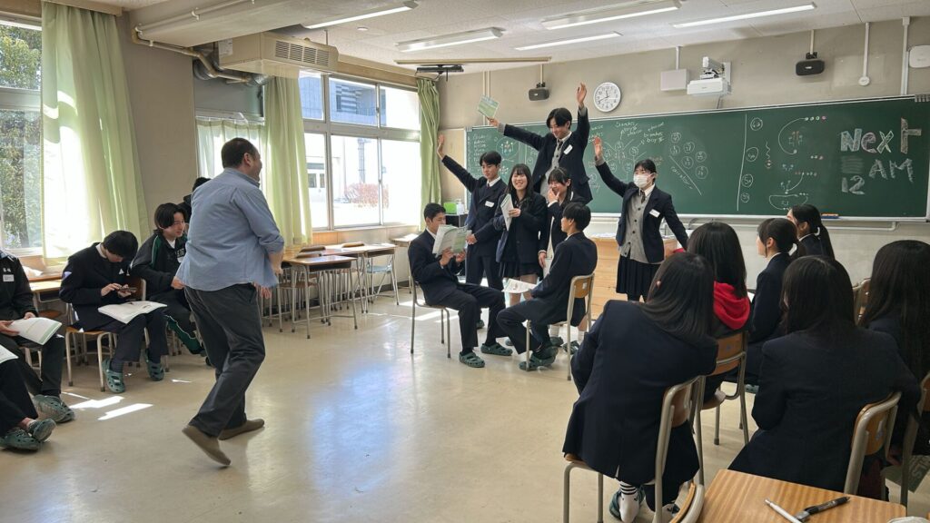 先日実施した東京都立高校の1日ワークショップでは、高校1年生の生徒約270名にご参加いただき、英語での活動を行いました。午前中にはペアでのダイアローグ発表、午後はグループごとに群読の発表を行いました。午前中の活動では、同じダイアローグを基にしながらも各ペアがシチュエーションを考えて工夫を凝らしていて、各教室からは歓声や笑いが聞こえてきました。