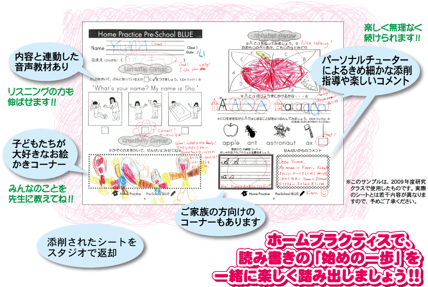 小学生クラスで大好評をいただいき、ご希望の声に応えてスタートした ご家庭用添削コース「ホームプラクティス」。おかげさまで幼児向けコースも大好評です!! 毎週のレッスンの復習として、また音声教材もあるので、リスニングや発音の練習用として、ぜひ通常のクラスとご一緒にお申し込みください。